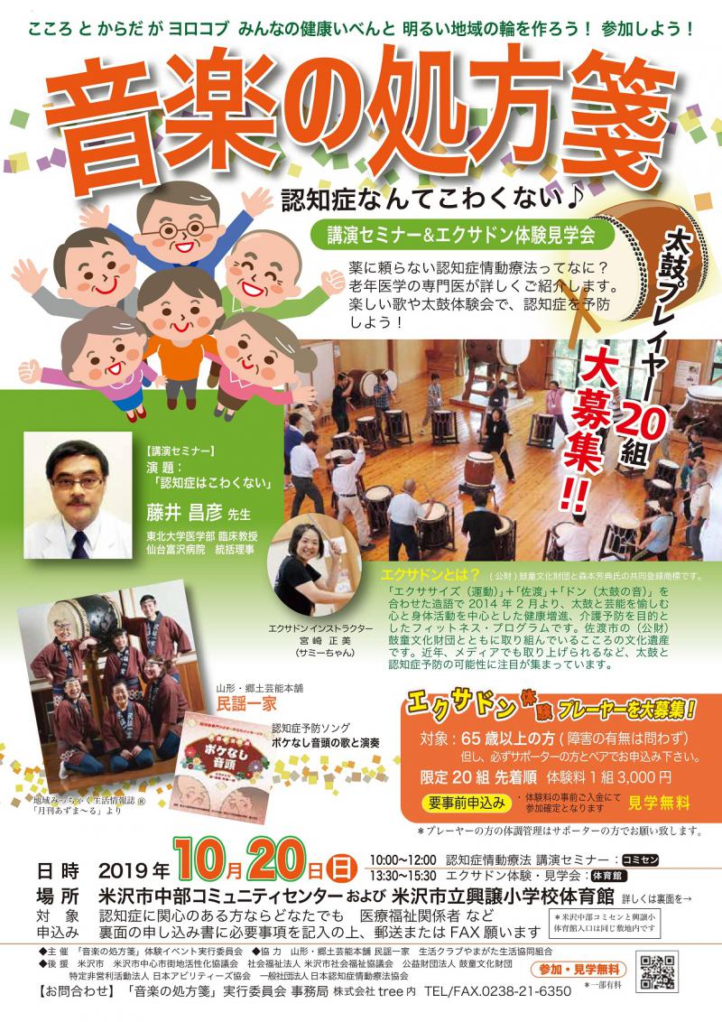 こころ と からだ が ヨロコブ みんなの健康イベント明るい地域の輪を作ろう! 参加しよう!音楽の処方箋 認知症なんてこわくない♪講演セミナー&エクサドン体験見学会薬に頼らない認知症情動療法ってなに?老年医学の専門医が詳しくご紹介します。楽しい歌や太鼓体験会で、認知症を予防しよう!参加・見学無料※一部有料 申し込み用紙詳しくはこちらのページをご覧くださいhttp://www.tree.co.jp/music/日 時2019年10月20日(日)●10:00〜12:00 認知症情動療法 講演セミナー :中部コミュニティセンター●13:30〜15:30 エクサドン体験・見学会:体育館場 所米沢市中部コミュニティセンターおよび米沢市立興譲小学校体育館(米沢中部コミセンと興譲小体育館入口は同じ敷地内です)対 象認知症に関心のある方ならどなたでも 医療福祉関係者 など申込み申し込み書に必要事項を記入の上、郵送またはFAX願います◆主 催「音楽の処方箋」体験イベント実行委員会◆協 力山形・郷土芸能本舗 民謡一家 生活クラブやまがた生活協同組合◆後 援米沢市 米沢市中心市街地活性化協議会 社会福祉法人米沢市社会福祉協議会 公益財団法人 鼓童文化財団特定非営利活動法人 日本アビリティーズ協会 一般社団法人 日本認知症情動療法協会講演セミナー10:00〜11:30 中部コミュニティセンター演 題:認知症なんてこわくない♪ 「認知症情動療法のすすめ」講師:藤井 昌彦 先生<プロフィール>・東北大学医学部 臨床教授・医療法人東北福祉会 理事長・仙台富沢病院 統括理事・山形厚生病院 理事長・一般社団法人 認知症情動療法協会 理事長民謡披露11:30〜12:00 中部コミュニティセンター山形・郷土芸能本舗 「民謡一家」の演奏認知症予防ソング「ボケなし音頭」の歌と演奏500円(送料別)◆詳しくは…「ボケなし音頭」チラシ(PDF)地域みっちゃく生活情報「月刊あずま〜る」よりエクサド見学・体験見学13:30〜15:30 エクサドン体験・見学会:体育館エクサドン インストラクター 宮崎 正美(サミーちゃん)太鼓プレイヤー20組 大募集!!エクサドン体験プレーヤー募集対象: 65歳以上の方(障害の有無は問わず)但し、必ずサポーターの方とペアでお申込み下さい。限定20組 先着順 体験料1組3,000円※見学は無料です要事前申込みが必要ですまずはお申込み下さい。詳細をご連絡致します。体験料の事前ご入金にて参加確定となりますプレーヤーの方の体調管理はサポーターの方でお願い致します申込み多数の場合は、先着順となります エクサドンとは?(公財)鼓童文化財団と森本芳典氏の共同登録商標です。「エクササイズ(運動)」+「佐渡」+「ドン(太鼓の音)」を合わせた造語で2014年2月より、太鼓と芸能を愉しむ心と身体活動を中心とした健康増進、介護予防を目的としたフィットネス・プログラムです。佐渡市の(公財)鼓童文化財団とともに取り組んでいるこころの文化遺産です。近年、メディアでも取り上げられるなど、太鼓と認知症予防の可能性に注目が集まっています。◆エクサドン https://www.exadon.com/お申込み方法・お申込み用紙に必要事項をご記入の上、FAX、郵便、メールなどで送付願います。送付・連絡先〒992-0044山形県米沢市春日5-1-40-4 株式会社tree内「音楽の処方箋」実行委員会 事務局 宛TEL/FAX.0238-21-6350メールアドレス madoguchi@tree.co.jp