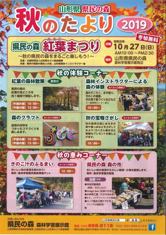県民の森より「秋のたより」が届きました♪10月27日(日)は「紅葉(もみじ)まつり」を開催します。紅葉が美しい県民の森で、様々なイベントが楽しめます。秋の県民の森をまるごと楽しみましょう!!県民の森「紅葉まつり」□日 時 令和元年10月27日(日)□時 間 AM10:00〜PM2:30□場 所 県民の森森林学習展示館周辺□イベント内容 ・紅葉の森林散策 ・森のクラフト ・森林インストラクターによる森の体験 ・秋の宝物さがし ・きのこ汁のふるまい ・県民の森秋の市□お問合せ先 県民の森学習展示館 TEL:023-666-2116 FAX:023-666-2124