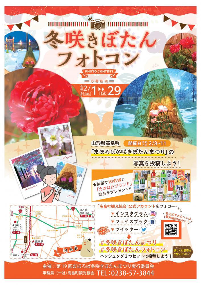 冬咲ぼたんフォトコン開催!!まほろば冬咲きぼたんまつりの写真を投稿して「たかはたブランド」商品をゲットしよう!応募期間:令和2年2月1日〜2月29日応募方法:@インスタグラム、フェイスブック、ツイッターのいずれかで 「高畠町観光協会」公式アカウントをフォロー。 Aイベントで撮影した写真を、「冬咲ぼたんまつり」及び 「冬咲ぼたんフォトコン」の2つのタグをつけて投稿。テーマ :「第19回まほろば冬先ぼたんまつり」及び「たかはた雪まつり」 で撮影した写真 ※花類、イベントの様子、グルメ、各地で行われているPR展示の様子などお問合せ:一般社団法人 高畠町観光協会п@ :0238-57-3844詳しくは添付ファイルのチラシ裏面をご覧ください。