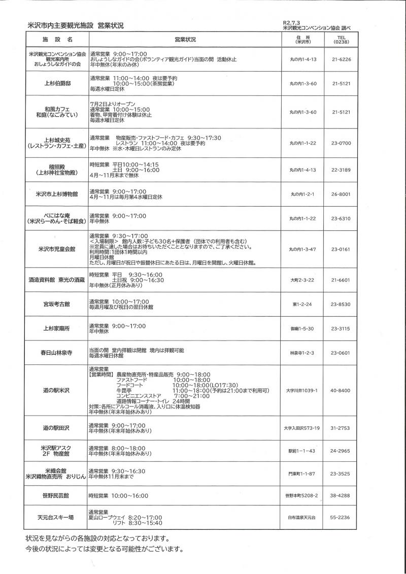 米沢市内の主要観光施設等の時短営業、休館等の情報をお知らせします。
