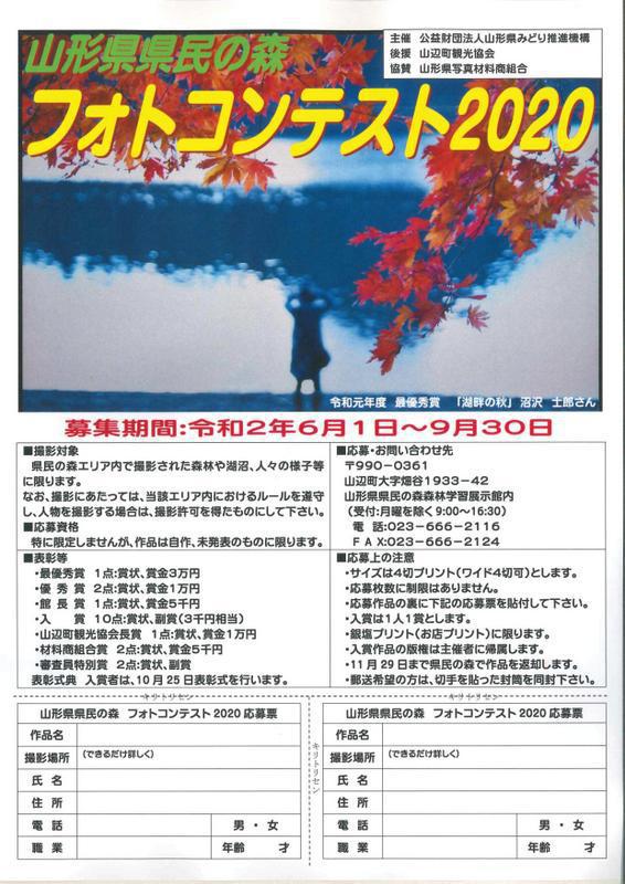 県民のいこいの場として親しまれている県民の森では、「フォトコンテスト2020」の作品を募集しています。撮影対象は、県民の森エリア内で撮影した森林や湖沼、人々の様子等です。四季折々の美しい県民の森の風景をカメラに収めてみませんか!最優秀賞に選ばれた作品には、賞状と賞金3万円が贈られます。その他多数の賞を準備しております。たくさんの応募をお待ちしております。 山形県県民の森フォトコンテスト□応募期間 令和2年6月10日〜9月30日□撮影対象 県民の森エリア内の様子□応募資格 特に限定しませんが、作品は自作、未発表のものに限ります。□応募・お問合せ先 〒990-0361 山辺町大字畑谷1933-42 山形県県民の森森林学習展示館内 (受付:月曜を除く9:00〜16:30) 電話:023-666-2116 FAX:023-666-2124