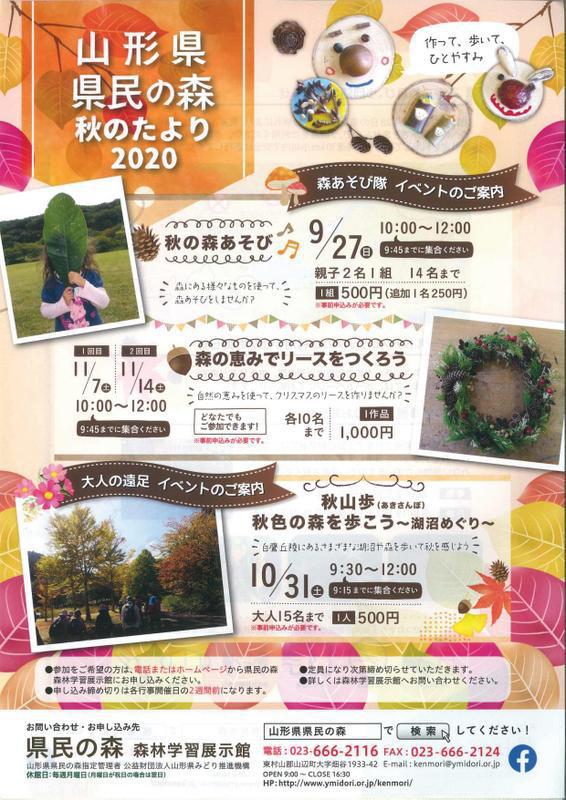 県民の森より秋のたよりが届きました♪暑い夏も終わり、紅葉の季節が近づいてきました。県民の森では、自然や森林と触れ合うことができる、様々なイベントを開催します。なお、新型コロナウイルス感染症予防のため、手指の消毒、マスク着用等のご協力をお願いします。 ■秋の森あそび日時・・9月27日(日)10:00〜12:00人数・・親子2名1組 14名まで料金・・500円(追加1名250円)■森の恵みでリースをつくろう日時・・11月7日(土)、11月14日(土)10:00〜12:00人数・・各10名料金・・1作品 1,000円■秋山歩 秋色の森を歩こう〜湖沼めぐり〜日時・・10月31日(土)9:30〜12:00人数・・大人15名料金・・500円※いずれも参加希望の方は、電話または県民の森ホームページにてお申し込み下さい。■秋の野草展日時・・9月19日(土)〜9月22日(火)場所・・森林学習展示館ホール料金・・無料 お問合わせ・申し込み先・・県民の森森林学習展示館電話:023-666-2116 FAX:023-666-2124
