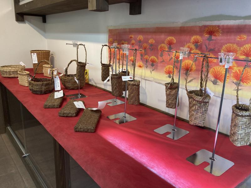 9月の荒砥駅展示室は、町内産の山ブドウやくるみ、あけびなどのつるを使って編んだ作品の数々を展示しています。