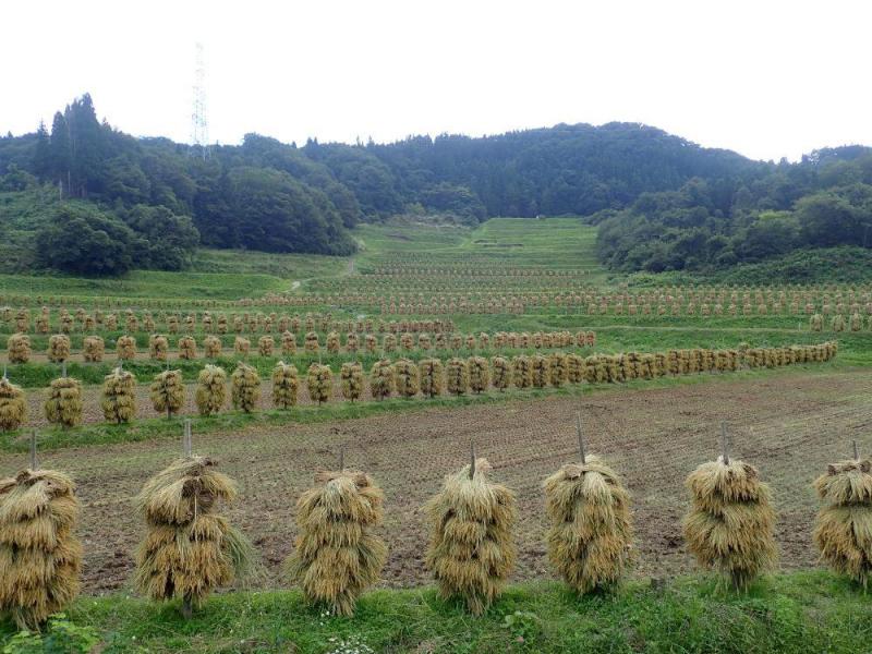 「日本の棚田百選」に選ばれている大蕨の棚田は、昔ながらの田園風景を残しています。9月24日現在は、ほぼ稲刈りも終わり、黄金色の稲ぐいが規則正しく立ち並んだ美しい景観をみることができます。杭掛け風景は10月の第2週頃まで見ることができます。