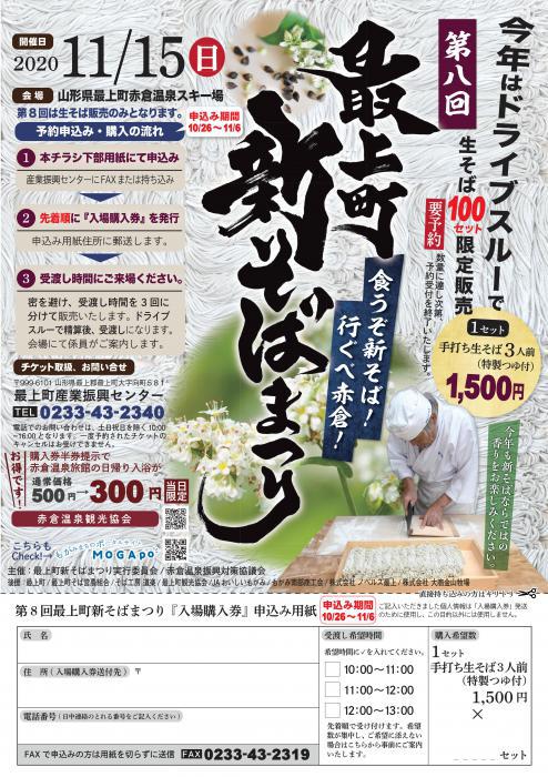 今年はドライブスルーで!! 第八回 最上町新そばまつり〜今年も新そばならではの香りをお楽しみください。〜【開催日】11月15日(日)【会 場】山形県最上町赤倉温泉スキー場 ★予約申込は10月26日から!!手打ち生そば 3人前(特製つゆ付) 1セット 1,500円 要予約 100セット限定販売 ★予約申込期間★10月26日(月)〜11月6日(金)数量に達し次第、予約受付を終了いたします。第8回は生そば販売のみとなります。 予約申込み・購入の流れ@チラシ下部用紙にて申込み最上町産業振興センターにFAXまたは持ち込み ↓A先着順に『入場購入券』を発行申込み用紙住所に郵送します ↓B11月15日、受渡し時間にご来場ください密を避け、受渡し時間を3回に分けて販売いたします。ドライブスルーで精算後、受渡しになります。会場にて係員がご案内します。 ★購入券半券提示で赤倉温泉旅館の日帰り入浴がお得に!赤倉温泉旅館加盟店での日帰り入浴が通常価格 500円⇒300円 当日限定!!申込の際はチラシを印刷してご利用ください。最上町新そばまつりチラシ.pdf ★チケット取扱・お問い合せ最上町産業振興センターTEL 0233-43-2340電話でのお問い合わせは、土日祝日を除く10:00〜16:00となります。一度予約されたチケットのキャンセルはお受けできません。 最上町の情報はもがぽで https://mogami-portal.net/