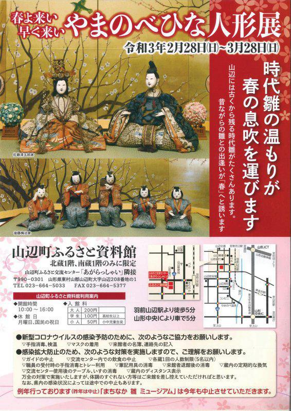 ふるさと資料館では、2月28日(日)から、「やまのべひな人形展」を開催します。山辺町には、江戸時代より最上川舟運や紅花交易で取り寄せたとされる貴重な時代雛がたくさん残されています。寛永から明治の時代雛をそれぞれ作られた時代の飾り方で、小道具一つ一つにもこだわりながら展示しています。作られた時代で違った特徴をもつ時代雛をゆっくりご覧ください。なお、まちなか雛ミュージアムは中止させていただきます。 「やまのべひな人形展」日 時:令和3年2月28日(日)〜3月28日(日) (月曜日・祝日は休館日)場 所:ふるさと資料館時 間:10:00〜16:00入館料:大人200円、学生(高校生以上)100円、小人(小中児童生徒)50円お問い合わせ先:ふるさと資料館 TEL023−664−5033※新型コロナウイルス感染状況によっては開催途中で中止の場合があります。※新型コロナウイルス感染予防のため、手指消毒・検温、マスクの着用、来館者の名簿への記入をお願いします。※体調のすぐれない方はご来館をご遠慮ください。