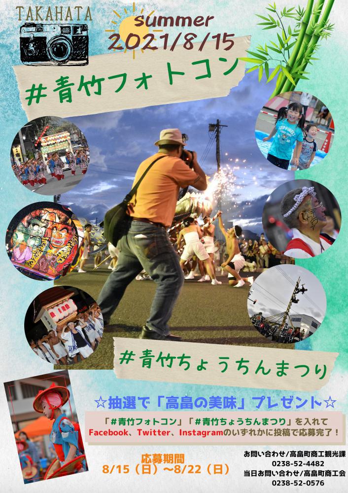 8月15日(日)たかはた夏まつりの中で青竹フォトコンというフォトコンテストを開催しますタグ付け「#青竹フォトコン」「#青竹ちょうちんまつり」でFacebook、Twitter、Instagramのいずれかに投稿で応募完了です応募期間は8/15〜22の1週間なので吟味する時間もたっぷりございます抽選で高畠の『美味いもの』が当たるので、皆様選りすぐりの写真をお載せください!