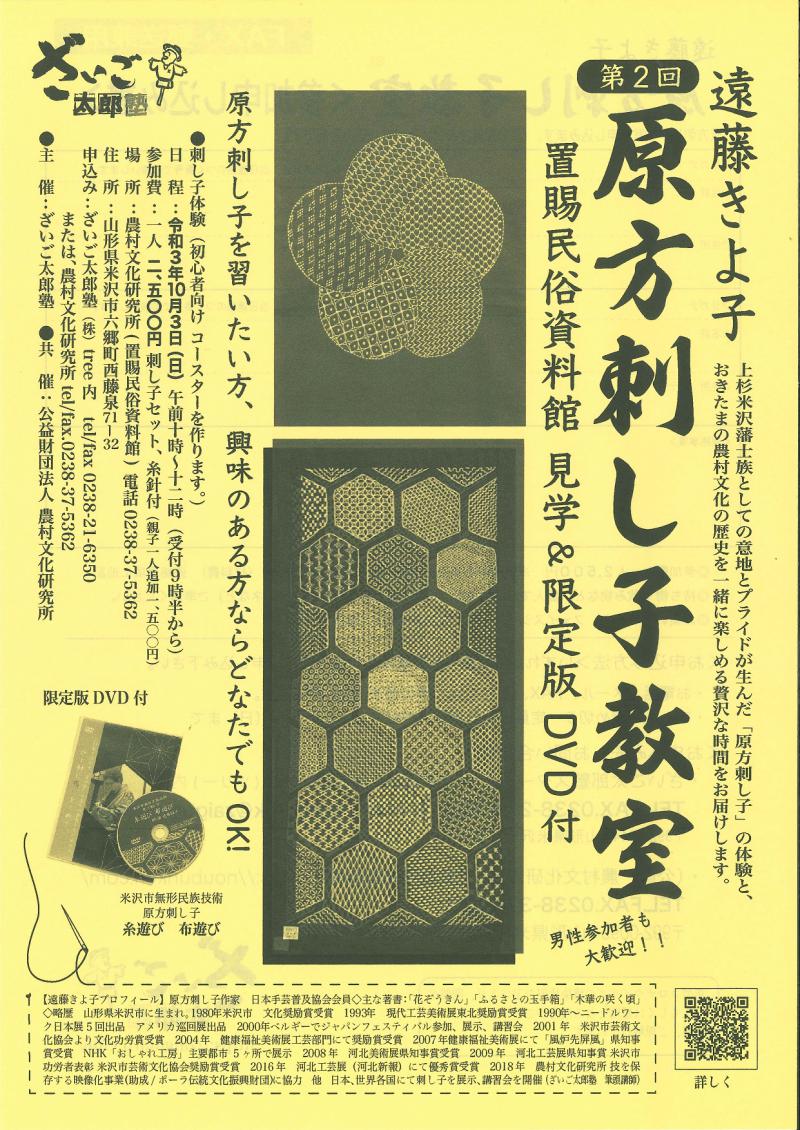 また、参加特典として原方刺し子の限定DVD付です。ぜひ参加ください。不便っておもしろい! よねざわで遊ぼう! 学ぼう! 元気になろう!遠藤きよ子 原方刺し子教室*今回は初心者向け ”コースター” をつくります。