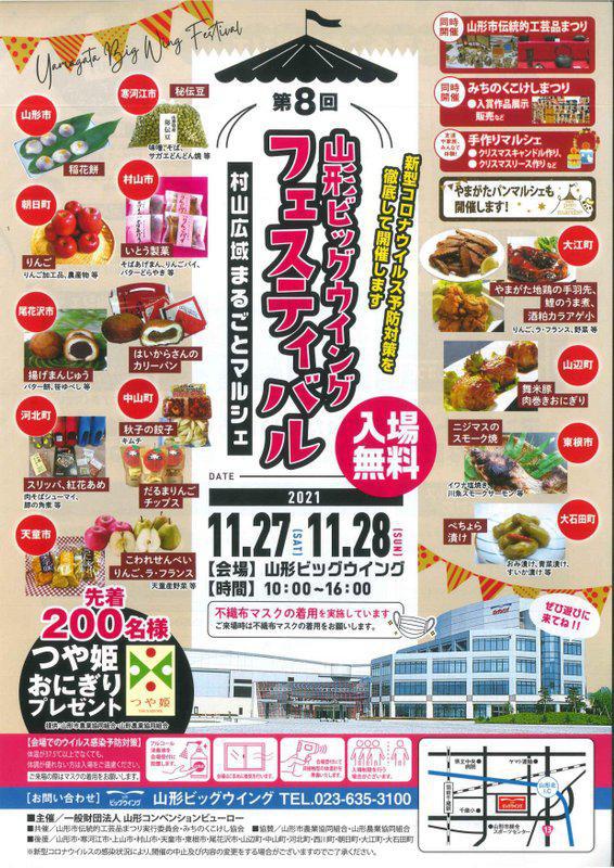 11月27(土)、28(日)は、「山形ビックウイングフェスティバル」が開催されます。村山広域の各市町村のうまいものが勢ぞろいします!山辺町からは、町の特産品舞米豚を使った『肉巻きおにぎり』を販売します。また、「山形市伝統的工芸品まつり」、「みちのくこけしまつり」、「パンマルシェ」が同時開催されます。皆様のお越しをお待ちしております♪※訂正・・大江町にある「酒粕カラアゲ小」は、河北町の出店物です。 第8回「山形ビックウイングフェスティバル」日時:2021年11月27(土)、28(日)会場:山形ビックウイング時間:10:00〜16:00お問い合わせ:山形ビックウイング 〔TEL〕023−635−3100