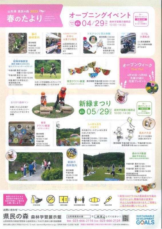 県民の森より春のたよりが届きました。いよいよ県民の森がオープンします。4月29日(昭和の日)は「オープニングイベント」、5月29日(日)は「新緑まつり」が開催されます。大人も子供も楽しめる様々なイベントが行われます。緑豊かな県民の森に遊びにきませんか♪◇オープニングイベント日時:2022年4月29日(昭和の日)時間:10:00〜14:30場所:森林学習展示館周辺イベント内容・春の森林案内・山辺高校コラボ企画手作りお菓子の販売・スモアつくり焚火体験・ミニSL大運動会・殺陣体験教室・青空クラフト教室◇新緑まつり日時:2022年5月29日(日)時間:10:00〜14:30場所:森林学習展示館周辺イベント内容・なりきり森林マン・青空クラフト教室・シャボン玉をとばそう・凧あげ大会・新緑の森林案内・森のヨガ教室お問い合わせ先:県民の森 学習展示館 TEL・・023−666−2116