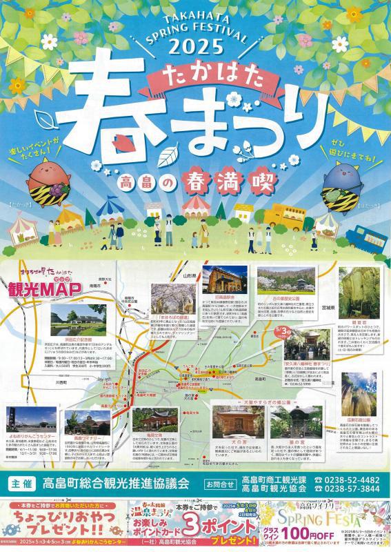 ↑春まつりチラシPDFはこちらから連休中の高畠町は楽しい、美味しいイベント盛りだくさん♪1日では足りないくらい、見所満載の高畠町です。ぜひ、この連休は高畠町に遊びに来てください!<主催> 高畠町総合観光推進協議会<お問い合わせ> 高畠町商工観光課 0238-52-4482 高畠町観光協会 0238-57-3844