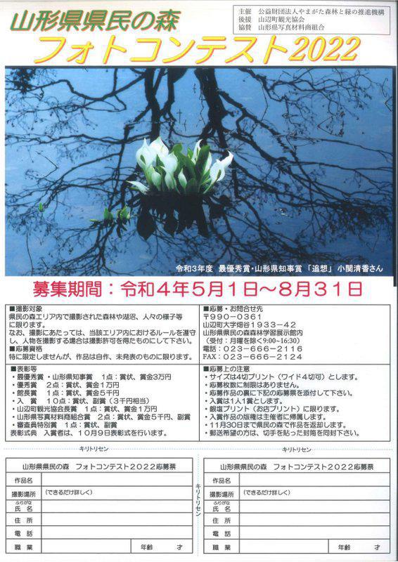 「県民の森フォトコンテスト2022」作品を募集します。撮影対象は、県民の森エリア内で撮影した森林や湖沼、人々の様子等です。四季折々の美しい県民の森の風景をカメラに収めてみませんか!最優秀賞に選ばれた作品には、賞状と賞金3万円が贈られます。その他多数の賞を準備しております。たくさんの応募をお待ちしております。山形県県民の森フォトコンテスト□応募期間 令和4年5月1日〜8月31日□撮影対象 県民の森エリア内の様子□応募資格 特に限定しませんが、作品は自作、未発表のものに限ります。□応募・お問合せ先 〒990−0361 山辺町大字畑谷1933-42 山形県県民の森森林学習展示館内 (受付:月曜を除く9:00〜16:30) 電話:023-666-2116 FAX:023-666-2124