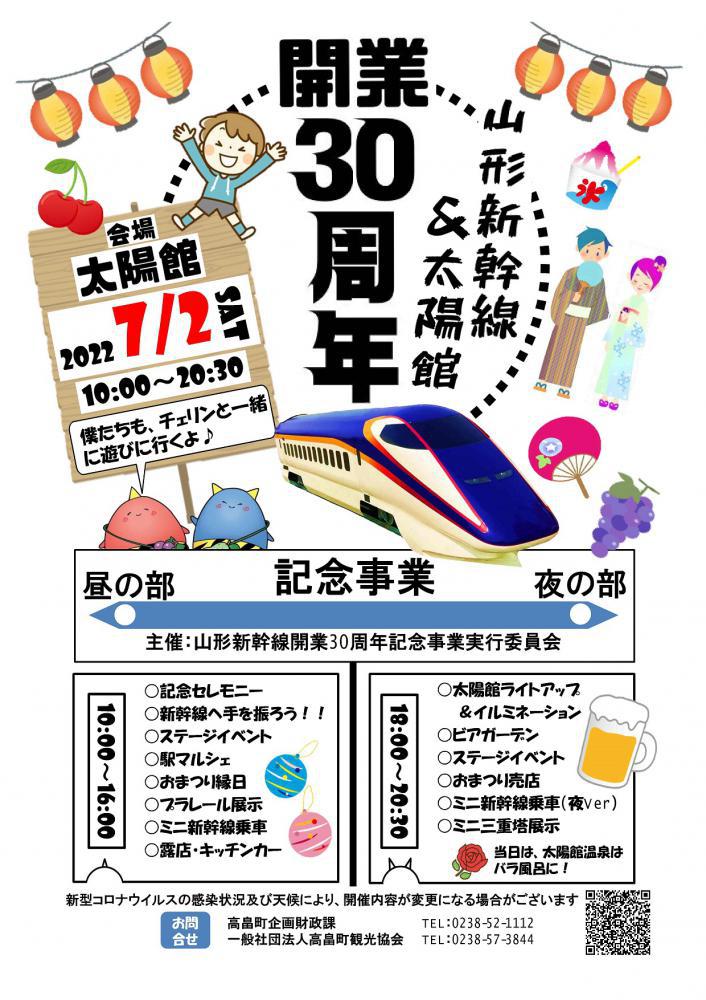 ↑イベントの詳細スケジュールはこちら!山形新幹線開業30周年と、太陽館開業30周年を祝い、記念イベントを開催いたします!山形新幹線つばさに手を振るイベントや、駅マルシェ、ステージイベント、ミニ新幹線乗車など、内容盛りだくさんで開催いたします♪夜の部はビアガーデンを開催します!ご家族みんなで楽しめるイベントです。ぜひお越しください!!○日 時:令和4年7月2日(土) ・昼の部10:00〜16:00 ・夜の部18:00〜20:30○場 所:高畠町太陽館(JR高畠駅)○駐車場:太陽館東側及び西側駐車場(無料)、県立高畠高等学校駐車場(臨時)○お問合せ: 高畠町役場企画財政課 TEL:0238-52-1112 高畠町観光協会 TEL:0238-57-3844
