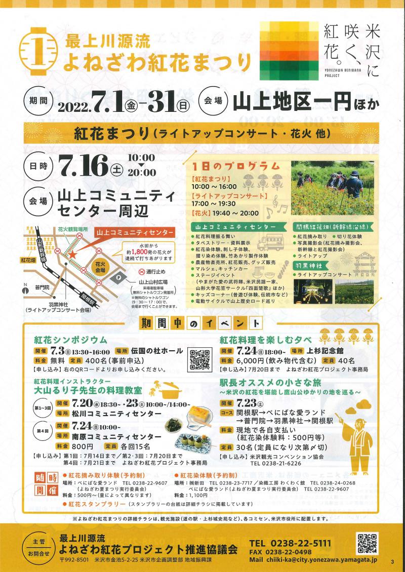 期間中、米沢の紅花文化を紹介する様々なイベントが開催されます。7月16日には紅花まつりが開催!ライトアップコンサートや花火など