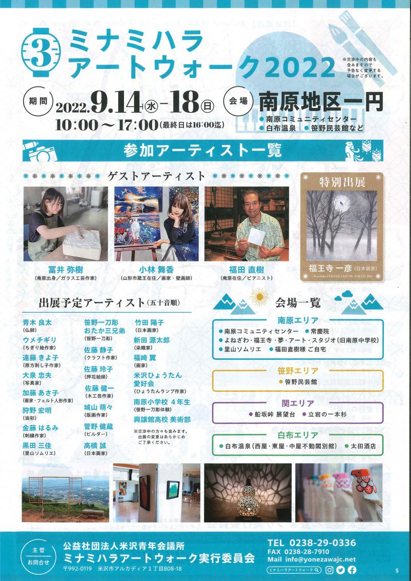 期間:7月1日(金)〜7月31日(日)会場:山上地区一円ほか 【よねざわ肉の陣】「肉で米沢を元気に!」をテーマに、牛、豚、鶏、羊、馬、ジビエ、各分野のスペシャリストを集め、肉料理で市民を元気にするイベントを開催します。日時:7月30日(土) 15:00〜20:00会場:松が岬おまつり広場 【ミナミハラアートウォーク】南原地区を舞台に開催している芸術やアートを活かした地域づくり事業です。南原コミセンをメイン会場に白布温泉・関地区など南原地区全域にエリアを拡大してアートを気軽に楽しむコトができます。日時:9月14日(水)〜9月18日(日) 10:00〜17:00会場:南原地区一円 【小野川温泉ほたるまつり】ほたるガイドやキッチンカー、ほたる竹あかりなどが行われ小野川温泉を美しい風景と共に楽しむことができます。期間:6月18日(土)〜7月17日(日)鑑賞場所:小野川温泉ほたる公園・小野川川沿い各所 【愛宕の火祭り】米沢市の南西部に位置する愛宕・羽山両神社のお祭りです。例年8月1日に開催される無病息災を祈る伝統祭礼で、早朝の「民衆登山」から始まり、夜は山頂までの神輿渡御が行われます。期間:8月1日(月)会場:愛宕神社ほか 【第59回米沢納涼水上花火大会】上杉神社を背景に、約6千発の花火が打ち上げられます。露店の出店や、歌ダンスのアトラクションが会場を盛り上げます。日時:8月5日(金) 19:30〜21:00 *荒天の場合は8月8日(月)に順延・アトラクション18:00〜19:10 ・花火打上19:30〜21:00 【米沢駅前仮装盆踊り大会】参加者が思い思いの格好に仮装して踊る盆踊り大会です。各賞も用意されており、子供から大人まで幅広い年代が仮装と踊りを競い合います。期間:8月14日(日)会場:米沢駅前多目的広場 【米沢市民納涼盆踊り大会】米沢盆踊り保存会が主催し、多くの市民が参加する盆踊り大会。米沢の盆踊りを正しい形で伝えいます。大きなやぐらの下、太鼓とお囃子の音色に合わせ盆踊りで夏の夜を楽しめます。日時:8月15日(月)〜8月16日(火) 19:00〜21:00会場:西條天満公園 米沢夏まつりホームページhttps://natsu.yonezawa-matsuri.jp/事務局【問い合わせ先】よねざわ夏まつり実行委員会米沢観光コンベンション協会内Tel:0238‐22-9607
