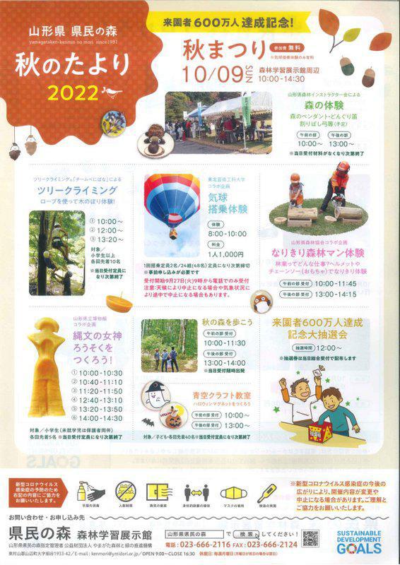 県民の森より秋の便りが届きました。10月9日(日)に「秋まつり」を開催します。県民の森の紅葉と様々なイベントをお楽しみ下さい♪ 「秋まつり」日時:10月9日(日) 10:00〜14:30場所:県民の森学習展示館周辺参加料:無料 ※気球搭乗体験のみ有料イベント内容・森の体験・ツリークライミング・気球搭乗体験 ・なりきり森林マン体験・縄文の女神ろうそくをつくろう!・秋の森を歩こう・青空クラフト教室・来場者600万人達成記念大抽選会お問い合わせ:県民の森森林学習展示館 TEL:023−666−2116