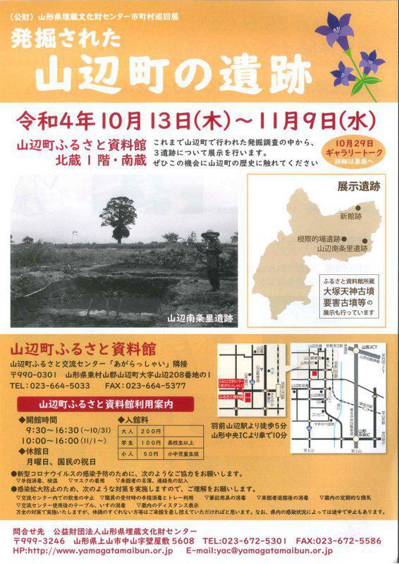 山辺町ふるさと資料館では、10月13日(木)〜11月9日(水)まで企画展「発掘された山辺町の遺跡」を開催します。山辺町で行われた発掘調査の中から3遺跡について展示します。また、10月29日(日)は歴史体験イベントが行われます。皆様のお越しをお待ちしております。 「発掘された山辺町の遺跡」日 時:令和4年10月13日(木)〜11月9日(水) 9:30〜16:30(〜10/31) 10:00〜16:00(11/1〜)場 所:ふるさと資料館 北蔵1階・南蔵休館日:月曜日、祝日入館料:大人200円 学生100円 小人50円 「歴史体験イベント」開催日:令和4年10月29日(土)イベント内容 ・縄文人体験イベント 10:00〜12:00 ※事前申込が必要です。 ・巡回展ギャラリートーク 13:05〜13:45 ・石器製作の実演 10:00〜12:00 13:00〜15:00 ・駄菓子屋 10:00〜12:00料金:無料 お問い合わせ:山辺町ふるさと資料館 TEL 023−664−5033