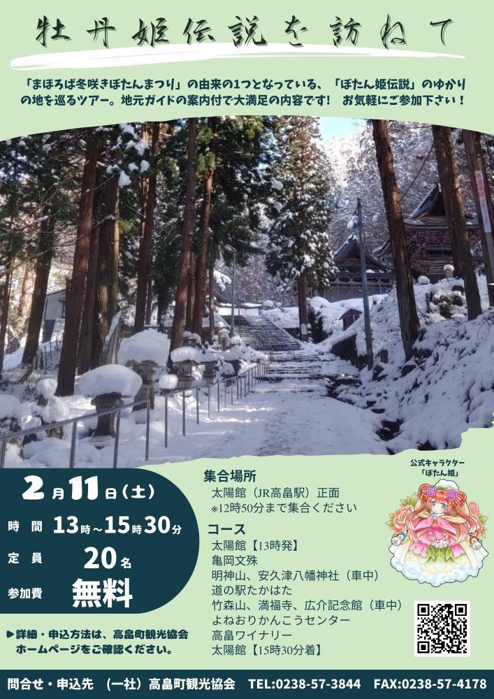 ↑詳細はこちらから第22回まほろば冬咲きぼたんまつりにおいて、町内観光名所を巡る周遊バスを運行いたします!「牡丹姫伝説を訪ねて」高畠町には「牡丹姫伝説」という伝説があり、ぼたんまつりの由来の一つともなっています。その伝説にゆかりのある地と高畠町の観光名所を地元ガイドと語り部がご案内いたします。・日時…2月11日(土) 13時出発 15時30分帰着・料金…無料・定員…20名(予約優先)・行程(天候により変更となる場合がございます。) 太陽館→亀岡文殊(滞在30分)→明神山、安久津八幡神社(車中)竹森山、満福寺、広介記念館(車中)→よねおりかんこうセンター(滞在20分)→高畠ワイナリー(滞在20分)→太陽館・添乗…まほろばの里案内人、まほろば語り部の会〇お申し込み先 高畠町観光協会 ・TEL:0238-57-3844 ・Mail:mahoroba@takahata.info(下記お問合せフォームでもお申し込みいただけます。) 件名に「周遊バス申し込み」と記載し、本文にご希望のコース、人数、代表者の氏名、住所、電話番号をご記載ください。※先着順となっております。ご希望の方はお早めにお申し込みください。