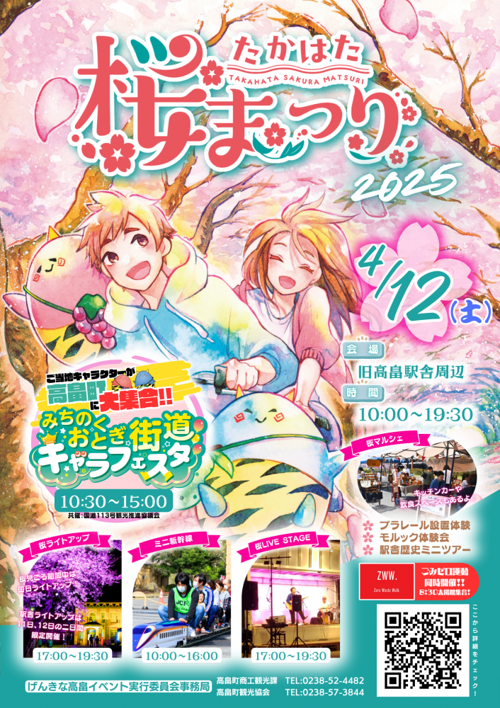 今年も「たかはた桜まつり」を開催いたします!モダンな石造りの建物が写真映えスポットとして人気の「旧高畠駅舎」周辺で、みちのくおとぎ街道キャラフェスタや桜マルシェ、駅舎歴史ミニツアーなど、沢山のイベントを予定しています!夜には桜と駅舎のライトアップとライブステージを行います!ぜひ、遊びに来てください! ◆開催日:令和7年4月12(土) 午前10時〜午後7時30分◆場 所:旧高畠駅舎周辺 (山形県東置賜郡高畠町高畠1568) ◆駐車場:旧千葉医院、山形第一信用組合本店、きらやか銀行高畠支店、多目的広場◆内容 ◆内容詳細〇みちのくおとぎ街道キャラフェスタ みちのくおとぎ街道の4市町(白石市、七ヶ宿町、南陽市、高畠町)を中心としたご当地キャラが大集結!観客の皆様も一緒に楽しめるゲームがあるステージや、キャラクターとのふれ合いタイムも予定しています。《時間》10時30分〜午後3時詳細はこちらから〇桜マルシェ美味しいグルメがやってくる!キッチンカーの出店やハンドメイド小物などの販売もあります。飲食スペースもご用意しております。《時間》午前10時〜午後7時 〇ミニ新幹線乗車子供達に大人気!ミニ新幹線に乗ってレッツゴー!《時間》午前10時〜午後4時(天候によって休止する場合があります) 〇プラレール設置体験こちらも子供達に大人気!自由にコースを組んで好きなプラレールを走らせてみよう!《時間》午前10時〜午後3時 〇駅舎歴史ミニツアー高畠町のボランティアガイド「まほろばの里案内人」が、旧高畠駅周辺をご案内します。午後2時〜4時の間は観光案内ブースに常駐していますのでお気軽にお声がけください。《ツアー時間》午後3時15分〜午後3時45分 〇桜ライブステージ地元で活躍しているアーティストのライブを開催します! ※写真は昨年度の様子です《時間》午後5時〜7時半 スケジュール 午後5時〜 メロメ 午後6時〜 実ノ丸。 午後6時50分〜 beginners high〇Zero Waste Walk〜みんなでお散歩ゴミ拾い~高畠町太陽館からまほろばの緑道を旧高畠駅までゴミ拾いをしながら歩きませんか?環境にいいことをした後はおいしいコーヒーを片手に一休み。 《日程》 午前 8時30分〜 高畠町太陽館(JR高畠駅)集合・レクチャー 午前 9時00分〜 ごみ拾いタイム(緑道を通って、太陽館から旧高畠駅) 午前10時00分〜 旧高畠駅到着 コーヒータイム・談話・順次解散《持ち物》軍手、コーヒー用のマグカップ(ごみ袋、トングは運営で用意いたします。)《申込》こちらのリンクからお申し込みください〇桜&駅舎ライトアップ 《駅舎ライトアップ期間》 4月11日(金)・12日(土) 点灯時間…午後5時〜午後7時30分《桜ライトアップ期間》 4月上旬〜中旬まで桜見頃の期間中は毎日ライトアップを行います 点灯時間…午後5時〜午後7時30分 ※開花状況によってライトの配置やライトアップ終了日を変更いたします◆お問い合わせ げんきな高畠イベント実行委員会 事務局 高畠町観光協会:0238-57-3844