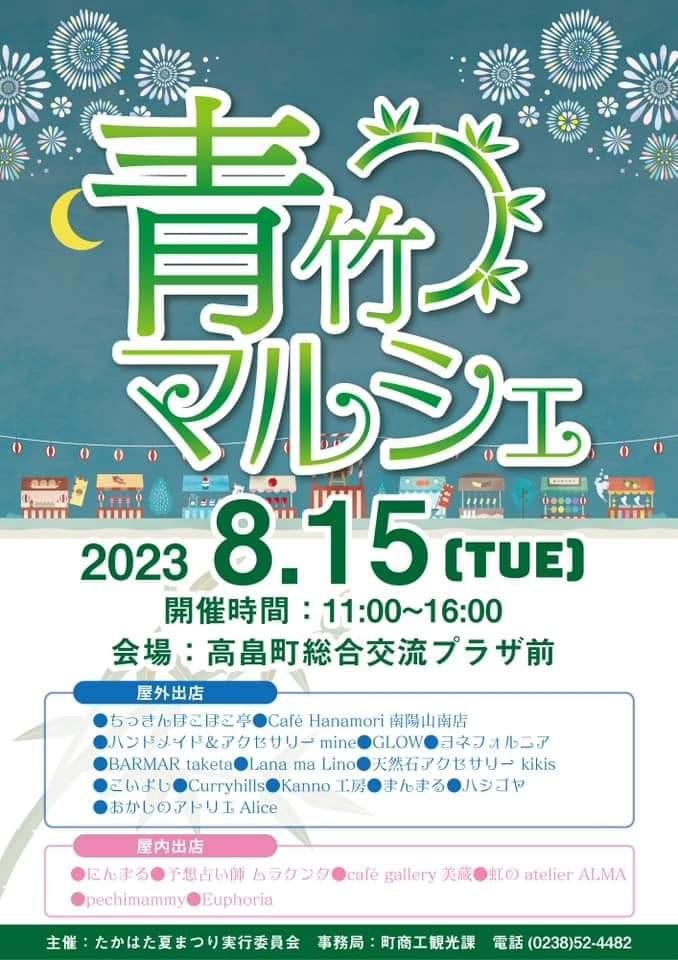 イベント詳細はこちら↑青竹ちょうちんまつりでは開催期間中、様々な楽しいイベントを開催いたします♪@青竹マルシェ・15日(火)11:00〜16:00・町総合交流プラザ前・ハンドメイド小物やアクセサリー、手作りお菓子や果物・野菜などを販売しますAミコミコちょうちん祭(主催:おれまか)・15日(火)13:00〜16:00・町総合交流プラザ駐車場・ミニ縁日…スーパーボールすくい、水ヨーヨー釣り・ミコいち(オタクグッズ譲渡会)…おれまかメンバー持ち寄りのアニメグッズフリーマーケット・キッチンカー出店Bぬりえスタジアム(主催:たまなび)・15日(火)11:00〜17:00・16日(水)10:00〜15:00・町総合交流プラザ 1階 多目的スペース・参加費1回300円・自分で色を塗ったちょうちょやカブトムシを画面の中で戦わせよう!参加者には素敵なプレゼントも♪詳細についてはそれぞれのチラシをご覧ください