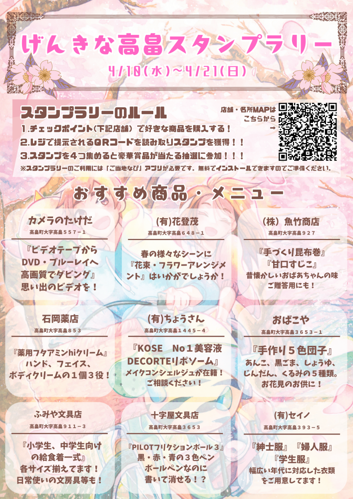 開催期間:令和6年4月10日(水)〜4月21日(日)ご当地なびアプリを活用したスタンプラリーを開催中!町内の協賛店舗と桜の名所を訪問してスタンプを4つ集めると 抽選で「たかはたブランド詰め合わせ」をプレゼントいたします。桜を見てまわりながら町内のお店に立ち寄ってみると、素敵な商品との出会いがあるかもしれませんね!ぜひ、この機会にスタンプラリーに参加してみてください♪参加される際はアプリのインストールおよび登録が必要です。ご当地なびの登録はこちらをご覧ください ★スタンプをゲットできる協賛店舗と桜の名所はこちらをご確認ください。(Googleマイマップ)※当選された方にはご当地なびアプリ登録時のメールにてやりとりをさせていただきます。◆お問い合わせ げんきな高畠イベント実行委員会 事務局 高畠町観光協会:0238-57-3844