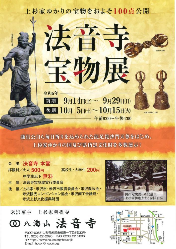 謙信公自ら毎日祈りを込められた泥足毘沙門天尊をはじめ上杉家ゆかりの国及び県指定文化財を多数展示!会 場・・法音寺 本堂期 間・・前期 令和6年9月14日(土) 〜9月29日(日) 後期 令和6年10月5日(土)〜10月15日(火)(※休館日 一部入れ替え: 9月30日 〜 10月3日)会場時間・・午前9時 〜 午後4時拝観料・・・大人500円/高校生・大学生200円/中学生以下無料主催 法音寺宝物展実行委員会米沢藩主 上杉家菩提寺 八海山 法音寺〒992-0055米沢市御廟1丁目5−32TEL0238−22−2095FAX0238−22−2096ホームページhttps://www.houon.org/e-mail houonji@houon.org後援 上杉家・米沢市・米沢市教育委員会・米沢上杉文化振興財団 米沢商工会議所・(一社)米沢観光コンベンション協会・米沢温故会