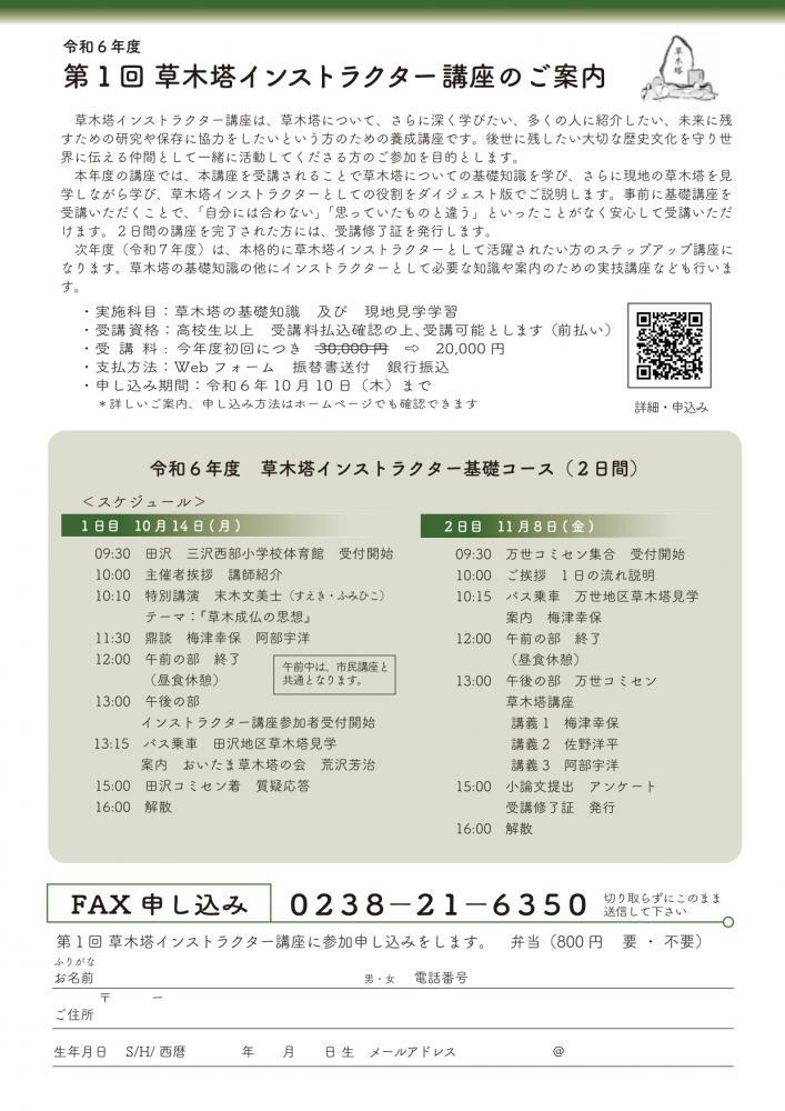 この度、草木塔市民講座及び同時開催 草木塔インストラクター講座が10月14日(月)開催されます。草木塔とは、現在は世界中に分布している石造文化財です。特徴として、「草木塔」「草木供養塔」「一仏成道観見法界草木国土悉皆成仏」と刻まれています。建立は江戸時代(1780年ころ)米沢市田沢地区の塩地平が発祥といわれ、創成期の草木塔は山形県置賜地域に多く分布しています。その建立理由は、まだはっきりとわかっていないものの、「草木国土悉皆成仏」という経文の全国的な使用傾向から墓石である可能性が判明しています。一方で近年は、「草木塔」というイメージから、「草木の霊魂」の存在を認めた上でその霊魂を供養する墓石、石塔と考え、環境保全、SDGsの象徴として注目されています。今回の講座はその多くの草木塔の謎に迫りながら、国際日本文化研究センター 名誉教授の末木文美士(すえきふみひこ)氏によるご講演をいただきその後、地元の研究者を交えた討論会を開催いたします。草木塔 市民講座日 時:10月14日(月・祝日)※事前申込不要(当日受付) 9:30 受付開始 10:00 開校 12:00 終了 場 所:米沢市田沢 旧三沢西部小学校 体育館 山形県米沢市口田沢2361-1 (田沢コミュニティセンターとなり)会 費:市民講座のみ 一人 500円(小・中学生無料) *直接、会場でお支払いください。 定 員:50名程度演 題 「草木成仏の思想」講 師 末木文美士(すえきふみひこ)氏プロフィール 1949(昭和24)年、山梨県甲府市生れ1973年 東京大学文学部印度哲学科卒1978年 東京大学大学院博士課程修了東京大学名誉教授、国際日本文化研究センター教授専門は仏教学、日本宗教史 第1回草木塔インストラクター講座10月14日(月)祝日・11月8日(金) 2日間 基礎講座 開催草木塔インストラクター講座は、草木塔について、さらに深く学びたい、多くの人に紹介したい、 未来に残すための研究や保存に協力をしたいという方のための養成講座です。草木塔の歴史文化を知り、世界に伝える仲間として一緒に活動してみませんか?本講座を受講されることで、草木塔についての基礎知識を現地を見学しながら学び、草木塔インストラクターとしての活動内容をダイジェストでご説明します。今年度の講座では、10月14日(月)祝日と11月8日(金)の2日間に渡って基礎講座が開催されます。10月14日(月)の午前の部は、一般の方と同じ内容を受講します。10/14午後と2日目(11/8)は 申込者だけで米沢市内にある草木塔(田沢地区10/14・万世地区11/8)の2箇所の草木塔の見学学習を行い両日の講座を受講された方に受講終了証を発行します。次年度は、本格的に草木塔インストラクターとして活躍したいという方のためのステップアップ講座になります。事前に基礎講座を受講いただくことで、「自分には合わない」 「思っていたものと違う」といったことがなく安心してご受講いただけます。観光案内や教育現場など、草木塔を案内できるインストラクターとしてをご検討されている方向けに行う講座です。日 時 10月14日(月)祝日・11月8日(金)場 所 米沢市田沢 旧三沢西部小学校 体育館および 田沢地区草木塔 4〜5箇所 田沢コミュニティセンター受講料 市民講座及び草木塔インストラクター 講座料(2日間分) 一人 20,000円(初回プレ講座価格)*事前振り込みで申込完了!(講師料、車代、テキスト代、保険料 含む)お申込み・お支払い方法 ・Peatixサイトから、お申込み・お支払い・口座振り込み(銀行、郵便局) 希望の方はメールにて連絡、後日、振込先をお知らせします。 fuben-ok@zaigotar.club