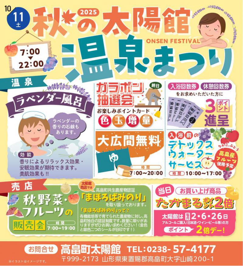 全国でもめずらしいJRの駅舎機能をを備えた温泉付きの総合コミュニティー施設、高畠町太陽館で「秋の太陽館温泉まつり」を開催します!売店では高畠の秋野菜・フルーツなどをお買い得価格で販売!太陽館で育てたラベンダーをふんだんに使用したラベンダー風呂をご用意してお待ちしています!日頃の疲れを癒してください〜ぜひ太陽館へ遊びに来てくださいね!◆日時 令和7年10月11日(土) ◆会場 高畠町太陽館(JR高畠駅) 〒999-2173 山形県東置賜郡高畠町大字山崎200-1 ◆お問い合わせ 高畠町太陽館 TEL:0238-57-4177