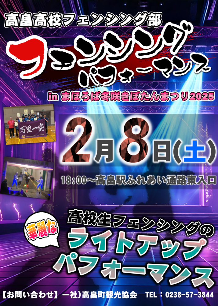 2月8日(土)の「まほろば冬咲きぼたんまつり」において高畠高校生フェンシング部による演武パフォーマンスが行われます!これを見ればフェンシングに少し詳しくなるかも!?ぜひ会場でご覧ください♪⇒悪天候のため中止となりました。楽しみにしていただいていた皆様には申し訳ありませんが、何卒ご理解のほどよろしくお願い申し上げます。