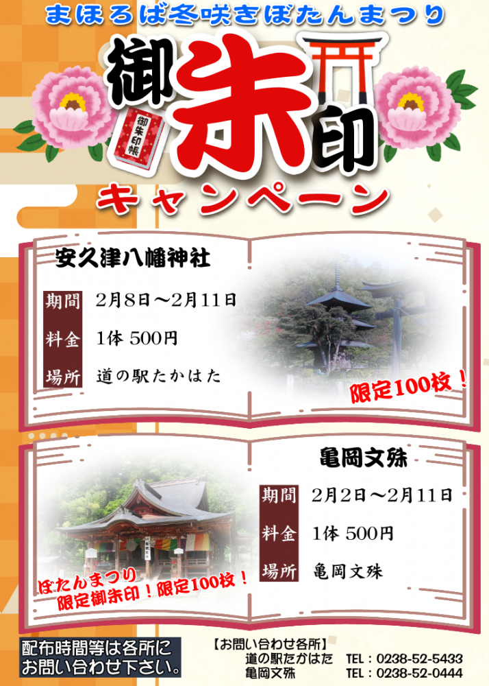 「まほろば冬咲きぼたんまつり」に合わせて限定御朱印が配布されますこの機会にぜひご参拝ください詳細は各所にお問い合わせください※安久津八幡神社、亀岡文殊ともそれぞれ限定100枚の配布となります※安久津八幡神社の御朱印は既存のデザインです