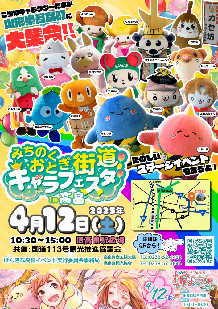 みちのくおとぎ街道を構成する4市町(白石市、七ヶ宿町、南陽市、高畠町)を中心とした、山形・福島のご当地キャラが大集合!さらに今回は、高畠町の友好都市「神奈川県横浜市栄区」のタッチーくんも来てくれます!みんなで楽しめるゲームがあるステージや、キャラクターとのふれ合いタイムもございます!参加団体及び、みちのくおとぎ街道の認知度向上と広域での観光の促進を行うことを目的に、たかはた桜まつり内で行われる新しいイベントです。ぜひ、可愛いキャラクター達に会いに来て下さいね!たかはた桜まつり詳細はこちらから◆開催日:令和7年4月12(土) 午前10時30分〜午後3時00分◆場 所:旧高畠駅舎周辺 (山形県東置賜郡高畠町高畠1568) ◆駐車場:旧千葉医院、山形第一信用組合本店、きらやか銀行高畠支店、多目的広場 ◆お問い合わせ げんきな高畠イベント実行委員会 事務局 高畠町観光協会:0238-57-3844