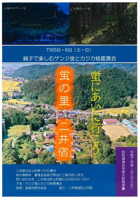 高畠町二井宿地区を流れる「大滝川」付近では、良好な水環境のあるところに生息する、貴重な「ゲンジ蛍」と「カジカ蛙」を見ることができます。イベント主催の「ゲンジ蛍とカジカ蛙愛護会」は、草刈や清掃、オオハンゴンソウ(環境省指定特定外来生物)の駆除、河川環境の監視や生活排水対策の呼びかけなど、希少生物が生息できる自然環境の保全・整備活動の継続を行っています。また、観賞会の開催や、二井宿小学校の児童の環境学習への協力、啓発活動なども行っており、この度、『令和7年度「みどりの日」自然環境功労者環境大臣賞』を受賞しました。そんな「ゲンジ蛍とカジカ蛙愛護会」の会員がご案内するスペシャルな鑑賞会です!ぜひご参加ください。〇日時:令和7年7月5日(土)・6日(日)〇集合場所:高畠町二井宿地区公民館 〒992-0301 山形県東置賜郡高畠町二井宿2796〇参加費:無料 〇お問い合せ:二井宿地区公民館 TEL 0238-52-1001主催:ゲンジ蛍とカジカ蛙愛護会協力:二井宿地区公民館後援:高畠町観光協会
