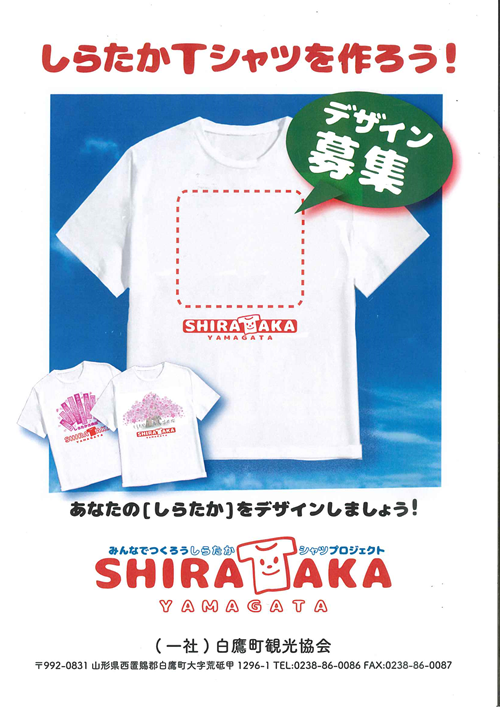 【Tシャツデザイン案大募集中】白鷹町の景色・催事・食べ物・人々などをテーマにイラストや写真、文字などデザインを募集しております。白鷹の魅力をTシャツに込めたデザインをお待ちしております。ご応募いただいた方の中から当選者5名様には、デザインされたTシャツをプレゼントいたします!皆さま、ぜひご応募ください。詳しくはチラシをご覧ください。