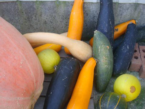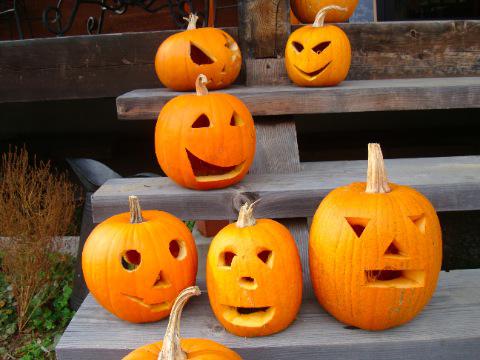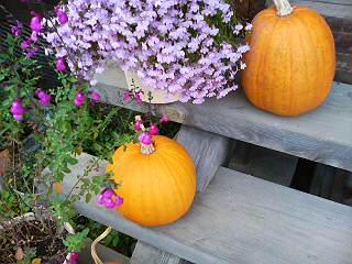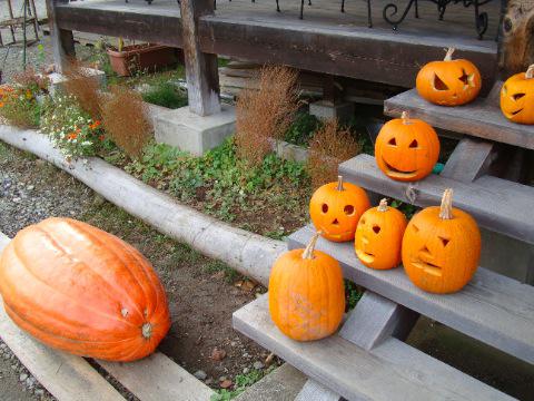 小野川温泉へ日帰り入浴の途中、栗ご飯膳とハーブ茶を飲食しました。画像は麦わらぼうしの入り口階段に置いていた南瓜。