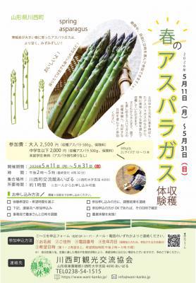\ 2026年「春のアスパラガス収穫体験」 参加者募集 /? この時期のアスパラガスは、甘みがあり、やわらかくてみずみずしいのが特徴です。 また、筋が残りにくいため、鮮度が良い採れたての春アスパラガスは、生で食べることもできます。 収穫したばかりのアスパラガスを、そのまま生で試食や焼いて試食する食べ比べは、この期間限定の体験です。ぜひご参加ください。?〇体験名「春のアスパラガス収穫体験」※開催期間中、希望する日時を受け入れ農家と調整を行い、開催する少人数参加型となっています。※すでに定員に達している日時や生育状況、受け入れ先の都合により、希望する日時で開催できない場合があります。あらかじめご了承ください〇開催期間2026年5月11日(月)〜5月31日(日)午後:2時〜5時(最終受付4時30分) ※午前中は不可〇開催内容 @春採れのアスパラガス収穫体験 ハサミで簡単に収穫できる体験です。アスパラガス10〜15本(約500グラム)をお持ち帰りいただけます。 Aアスパラガス畑で試食体験 収穫したアスパラガスを生や焼いて試食する体験を行います。特に生での試食は、春しかできない季節限定の体験です。(生の試食は希望する方のみ)〇定員 各日 5名様 (お申込みは1名様から受け付けます)〇参加費 大人 2,500円(持ち帰りあり、畑で試食体験、保険込み) 中学生以下 2,000円(持ち帰りあり、畑で試食体験、保険込み) 未就学児以下 無料(持ち帰りなし、保護者同伴)〇締切日 開催日の5日前まで ※定員になり次第締め切りとさせていただきます。〇参加にあたっての確認事項について ・小雨の場合は決行、荒天の場合は中止となります。中止の場合は、前日の夕方午後5時までご連絡をいたします。 ・マスクの着用は、参加される方でご判断ください。 ・参加日により他の参加者と合同となる場合があります。〇お申込み方法 下記の申込みフォーム、メール、お電話にてご連絡ください。 希望する日時について、第一希望、第二希望、希望開始時間をお知らせください。 受け入れ農家と調整を行い、お申込みの方に事務局よりご連絡いたします。 お問い合わせ先:川西町観光交流協会 メール:info@wani-kanko.jp 電 話:0238-54-1515 申し込みフォームはこちらから ▼▼▼ https://forms.gle/RuSd4YTnXVmRsU6GA