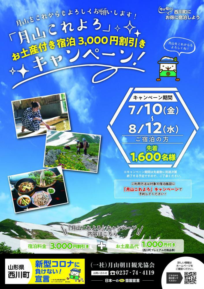 月山がある町、西川町では、「『月山』を、これからもよろしくお願いします!」という思いをこめた「月山これよろキャンペーン」が実施されます!宿泊料金割引き+西川町プレミアム付商品券プレゼントというお得なキャンペーンとなっておりますので、皆様、ぜひ、ご利用ください。詳細は、西川町月山朝日観光協会公式サイト「ぶらり西川ガイド」(https://www.gassan-info.com/news/730)をご覧ください。
