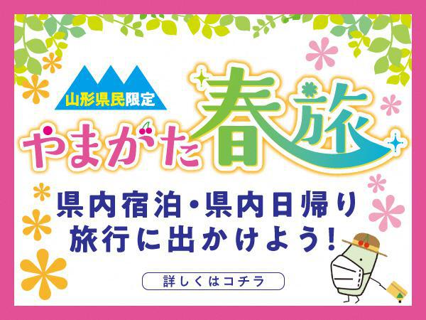 山形県民限定 県民泊まってお出かけキャンペーン〜やまがた春旅〜が始まっています!宿泊や日帰り旅行が最大5,000円割引。さらに地域共通クーポンが2,000円配布という大変お得なキャンペーンとなっております。皆様、ぜひご利用ください。 詳細はやまがた春旅ホームページをご覧ください。https://yamagata-harutabi.com/ お問い合わせ先 やまがた春旅コールセンター TEL:0570-087125 まで