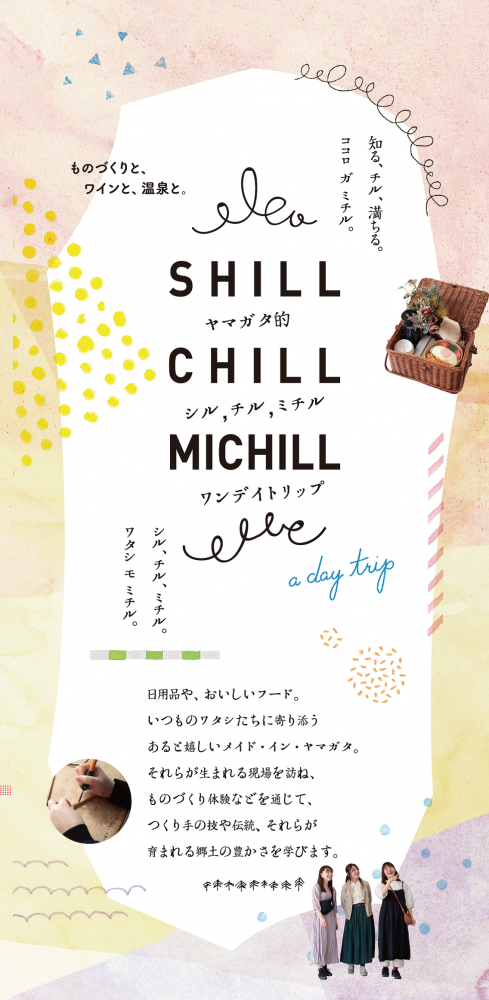 知るチル満ちる。ココロガミチル。ワタシモミチル。 そんな山形の旅をするのであれば、「SHILL CHILL MICHILL」を参考に! 東北芸術工科大学学生のアイデアから企画された「チル旅」は、やさしく、のんびりと楽しめること間違いなしです。 上山のワイナリーなどをオリジナルのランチBOXを持って巡ってみてはいかかがでしょうか。 詳細はぜひホームページをご覧になってください。 https://www.kaminoyama-chill.jp