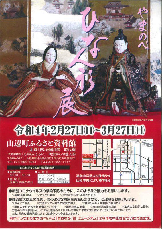 ふるさと資料館では、2月27(日)〜3月27(日)まで、「やまのべひな人形展」を開催します。山辺町には、江戸時代より最上川舟運や紅花交易で取り寄せたとされる貴重な時代雛がたくさん残されています。寛永雛・元禄雛・享保雛・古今雛などそれぞれの時代雛の特徴の違いをゆっくりご覧ください。 「やまのべひな人形展」日 時:令和4年2月27日(日)〜3月27日(日) (月曜日・祝日は休館日)場 所:ふるさと資料館時 間:10:00〜16:00入館料:大人200円、学生(高校生以上)100円、小人(小中児童生徒)50円お問い合わせ先:ふるさと資料館 TEL023−664−5033※新型コロナウイルス感染状況によっては開催途中で中止の場合があります。