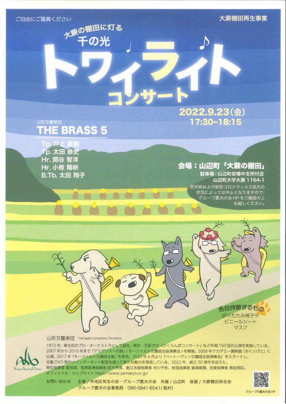 日本の棚田百選に選出されている「大蕨の棚田」で山形交響楽団のメンバー5人による「トワイライトコンサート)開催します。秋の夜長に、イルミネーションで灯された棚田の中で山形交響楽団の音楽をお楽しみ下さい♪ 日時:9月23日(金・祝日)会場:山辺町「大蕨の棚田」駐車場:山辺町役場中支所(コンサート会場まで徒歩約5分)料金:無料お問い合わせ:グループ農夫の会事務局 TEL:090−5841−6541