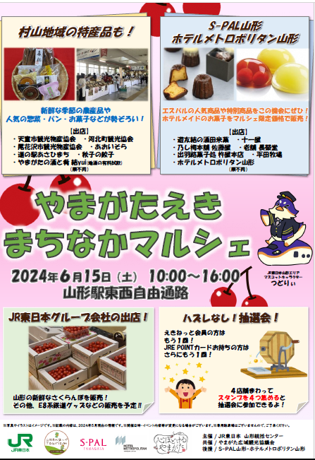 村山地域の新鮮な季節の農産品をはじめとした特産品などを集め、あわせて各地の観光イベント情報をPRする「やまがたえき まちなかマルシェ」を下記のとおり開催します。 日時:6月15日(土)10時から16時まで、 場所:JR山形駅「東西自由通路」村山地域の野菜やフルーツ、菓子等の販売を行う「マルシェ」や、花笠踊り、ストリートダンスパフォーマンス、ご当地キャラふれあいといった会場全体を盛り上げる「ステージイベント」など、内容盛りだくさんのイベントです。皆さん、ぜひお越しください!! チラシはこちらやまがたえき まちなかマルシェチラシ