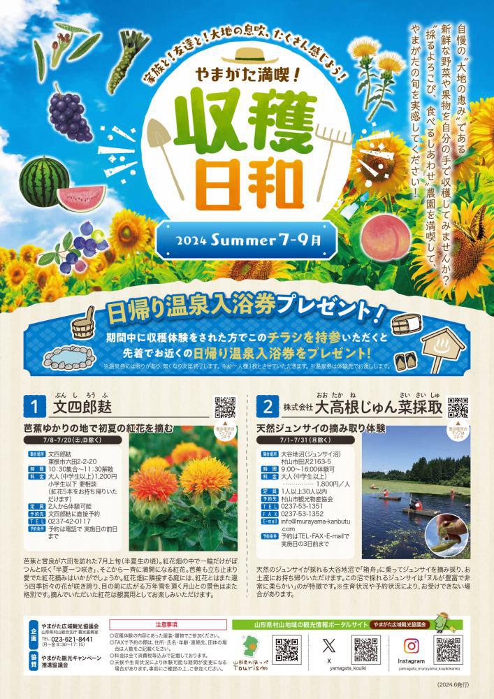 旬の野菜や果物の収穫体験ができる企画「やまがた満喫!収穫日和」の夏企画がスタートします! 自分の手で収穫することで「採るよろこび」「食べるしあわせ」を実感できる体験企画です。 ぜひご家族やお友達と夏の思い出作りにお越しください! 【先着で日帰り温泉入浴券プレゼント!】 期間中に収穫体験をされた方でチラシを持参いただくと、先着で農園近くの日帰り温泉入浴券をプレゼントします。 農園によって体験可能期間が異なりますので、お早めに予約をお願いします。 収穫体験の内容や予約先などはチラシをご覧ください。 チラシ【参加農園】1 文四郎麩(紅花摘み体験)2 (株)大高根じゅん菜採取(ジュンサイ摘み)3 大沼ファームブルーベリーガーデン(ブルーベリー収穫体験)4 一般社団法人We are the World大富農産(本わさび掘り体験)5 だいちゃん農園GUEST HOUSE(くだもの狩りとBBQ)6 菅野農園(すいか収穫体験)※菅野農園(すいか収穫体験)については、諸般の事情により中止となりました。楽しみにされていた皆様にはご迷惑をおかけしますが、ほかの収穫体験にお申込みください。7 東根市観光物産協会 観光果樹園部会加盟園地(もも狩り、ぶどう狩り)