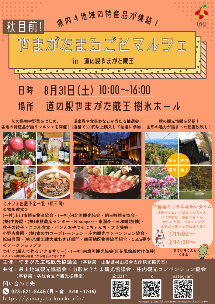 「秋目前!やまがたまるごとマルシェ in 道の駅やまがた蔵王」を開催します。県内4地域の特産品等を販売するマルシェのほか、秋の行楽シーズンに向けた各地域の観光情報もGETできます!温泉券・食事券などが当たる抽選会や、桃色ウサヒ・ペロリンなど県内各地の人気ご当地キャラに会えるご当地キャラふれあいタイムもありますので、ぜひご来場ください。詳細はチラシをご覧ください。皆様のご来場をお待ちしております! 【日時】 令和6年8月31日(土) 10時〜16時【会場】 道の駅やまがた蔵王 樹氷ホール ☆出展予定一覧(順不同)《物販飲食》・(一社)上山市観光物産協会(ワイン・ジュースの販売と有料試飲、ドライフルーツ)・(一社)河北町観光協会(冷たい肉そば(お土産)、紅花種茶、紅染めハンカチなど)・朝日町観光協会(りんご、りんご加工品、総菜、桃色ウサヒグッズ、ジュース絞り体験)・樺條屋(中條饅頭、あんころもち)・鞄訣ェ農産センター(フルーツシェイク、青果物)・N-support(舞米豚肉巻きおにぎり、舞米豚メンチカツ)・東園亭(昆布巻、ニシンの一本煮、昆布とごぼうのうま煮)・三和罐詰梶i山形パインサイダー、パインサイダーゼリー)・秋子の餃子(焼餃子、焼きそば、玉こんにゃく、キムチ)・二コル食堂(特産品を使ったおむすび)・パンとおやつそよちゃんち(パン各種)・大沼養蜂(はちみつ、まいたけご飯、笹巻き、はちみつドリンク・塩わらび)・小野寺農園(乾燥しいたけ、きくらげ詰め放題、ぶどうジュース)・叶Hの力コーポレーション(冷製スープ(大豆ミート関連)、乾燥大豆ミート)・庄内観光コンベンション協会(食品・農産物、土産品)・松田農園(夏野菜、加工品)・株ェ鍬土建大蔵わさび部門(大蔵わさび他)・鶴岡地区物産協同組合(食品・農産物)・CoCo夢や(どんどん焼き、かき氷)《ワークショップ》・つむぐ(クラフトバンドを使ったヘアゴム・ペンダント作り)・(一社)白鷹町観光協会(紅花風鈴絵付け体験) ※イベント内容等が変更になる場合がございます。 地図