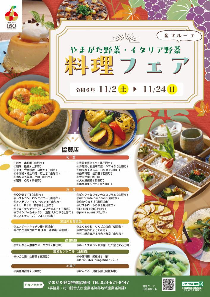 〇 概要 村山地域で栽培された「やまがた野菜」と「イタリア野菜」、「フルーツ」を使ったオリジナルメニューが味わえる「やまがた野菜・イタリア野菜&フルーツ 料理フェア」を開催いたします。オリジナル料理を食べてアンケートにご回答いただいた方の中から、抽選で合計20名様に「やまがた野菜・イタリア野菜の詰め合わせ」などをプレゼントします。ぜひこの機会に旬のやまがた野菜・イタリア野菜・フルーツをお召し上がりください。【期間】令和6年11月2日(土)〜24日(日)まで【場所】村山地域の38の協賛店※「やまがた野菜」とは、村山地域で郷土の食材として古くから受け継がれてきた「村山伝統野菜」と、生活や風土に根ざし季節や旬を感じさせる「村山特産野菜」を合わせたものの愛称で、合わせて58品目が認定されています。 また、村山地域では、寒暖差の大きいイタリア北部と似た気候を活かし「イタリア野菜」が栽培されています。 さらに、来年は山形県で果樹の栽培が始まって150年となる記念すべき節目の年「やまがたフルーツ150周年」を迎えるため、タイアップして実施します。○ 内容・村山地域の協賛店38店において、旬の「やまがた野菜」「イタリア野菜」「村山地域産フルーツ」を使用した各店舗オリジナル料理(スイーツ含む)が味わえます。・オリジナル料理等を食べて、アンケートにご回答いただいた方の中から抽選で合計20名様に「やまがた野菜・イタリア野菜の詰め合わせ」又は、「ペロリングッズ」(おいしい山形推進機構協賛)をプレゼントします。〇 関連リンク(山形県HP)※随時更新https://www.pref.yamagata.jp/301041/sangyo/nourinsuisangyou/nogyo/nousambutsu/ryourifea.html ○ 主催 やまがた野菜推進協議会(事務局 山形県村山総合支庁地域産業経済課)○ この記事に関するお問い合わせ担当課:山形県村山総合支庁地域産業経済課担 当:農産物利用拡大・調整担当電 話:023-621-8447