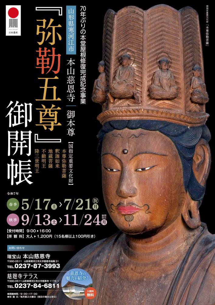 慈恩寺本堂茅葺屋根修繕工事完了を記念し、本山慈恩寺では来年、11年ぶりに御本尊を御開帳いたします。来年は2回特別公開を実施しますので、長い期間御本尊をご覧いただけます。 期間令和7年5月17日(土)〜7月21日(月祝)9月13日(土)〜11月24日(月祝) 拝観料大人 1,200円(15名様以上1,100円) お問い合わせ先本山慈恩寺0237-87-3993
