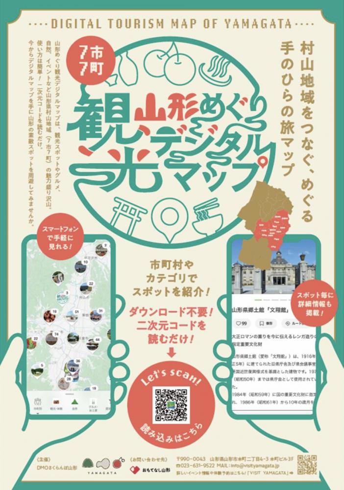 【山形めぐり観光デジタルマップ】スマホで旅を便利に!村山地域の情報満載&FAQ .section-fade { opacity: 0; transform: translateY(20px); transition: opacity 0.8s ease-out, transform 0.8s ease-out; } .section-fade.visible { opacity: 1; transform: translateY(0); } /* システムのCSS対策用の汎用スタイル */ .hoppe-container { font-family: "Hiragino Kaku Gothic ProN", "Meiryo", sans-serif; line-height: 1.8; color: #333; background: transparent !important; padding: 20px 15px; max-width: 100%; box-sizing: border-box; } .hoppe-h1 { font-size: 26px; font-weight: bold; color: #00796B; border-bottom: 3px solid #80CBC4; padding-bottom: 10px; margin: 0 0 25px 0; line-height: 1.4; text-align: center; background: transparent !important; } .hoppe-h3 { font-size: 22px; font-weight: bold; color: #fff; background-color: #00796B; padding: 12px 20px; margin: 40px 0 20px 0; border-radius: 5px; display: flex; align-items: center; } .hoppe-p { margin: 0 0 1.5em 0; background: transparent !important; } .faq-box { border: 1px solid #ddd; margin-bottom: 15px; border-radius: 5px; } .faq-q { background-color: #f7f7f7 !important; padding: 15px; font-weight: bold; } .faq-a { padding: 15px; background-color: #fff !important; } .footer-note { text-align: right; font-size: 12px; color: #666; margin-top: 40px; padding-top: 15px; border-top: 1px solid #eee; } .icon-style { font-family: 'Font Awesome 6 Free' !important; font-weight: 900 !important; margin-right: 12px; color: #fff; } { "@context": "https://schema.org", "@graph": [ { "@type": "Article", "headline": "山形めぐり観光デジタルマップ|スマホで旅を便利に!村山地域の情報満載", "author": { "@type": "Organization", "name": "ほっぺtourism", "url": "https://yamagata-kouiki.info/" }, "publisher": { "@type": "Organization", "name": "ほっぺtourism", "logo": { "@type": "ImageObject", "url": "https://yamagata-kouiki.info/wp/wp-content/themes/yamagata-kouiki/images/ogp.jpg" } }, "image": "https://yamagata-kouiki.info/wp/wp-content/themes/yamagata-kouiki/images/ogp.jpg", "datePublished": "2025-07-20T09:00:00+09:00", "dateModified": "2025-07-20T09:00:00+09:00" }, { "@type": "FAQPage", "mainEntity": [ { "@type": "Question", "name": "デジタルマップを使うのにお金はかかりますか?", "acceptedAnswer": { "@type": "Answer", "text": "いいえ、このデジタル観光マップは無料でご利用いただけます。アプリのインストールなども不要で、ウェブブラウザで直接お使いいただけます。" } }, { "@type": "Question", "name": "どんな情報が載っていますか?", "acceptedAnswer": { "@type": "Answer", "text": "山形県村山地域(7市7町)の観光スポット、飲食店、お土産店、温泉、自然景観、イベントなど、旅に役立つ様々な情報が掲載されています。" } }, { "@type": "Question", "name": "マップから各施設へのルート検索はできますか?", "acceptedAnswer": { "@type": "Answer", "text": "はい、マップ上の各スポット情報から、お使いのスマートフォンの地図アプリを起動して、現在地からのルートを検索することができます。" } } ] } ] } document.addEventListener("DOMContentLoaded", () => { const sections = document.querySelectorAll(".section-fade"); const observer = new IntersectionObserver( entries => { entries.forEach(entry => { if (entry.isIntersecting) { entry.target.classList.add("visible"); observer.unobserve(entry.target); } }); }, { threshold: 0.1 } ); sections.forEach(section => { observer.observe(section); }); }); 山形めぐり観光デジタルマップ あなたのスマホが、最高の旅のガイドに。山形県村山地域の魅力、ぜんぶこのマップに。 「山形めぐり観光デジタルマップ」は、観光スポットやグルメ、自然、イベントなど山形県村山地域(7市7町)の魅力が盛りだくさんのウェブマップです。アプリのインストールは不要!今すぐデジタルマップを手に、山形の素敵なスポットを巡る旅に出かけませんか? 使い方は簡単!3ステップ STEP 1 スマホで二次元コードを読む STEP 2 デジタルマップを開く STEP 3 旅に出かけよう! 山形めぐり観光デジタルマップはこちら▼ デジタルマップを開く 対象エリア(村山地域 7市7町) 山形市 寒河江市 上山市 村山市 天童市 東根市 尾花沢市 山辺町 中山町 河北町 西川町 朝日町 大江町 大石田町 よくある質問 (FAQ) Q.デジタルマップを使うのにお金はかかりますか? A.いいえ、このデジタル観光マップは無料でご利用いただけます。アプリのインストールなども不要で、ウェブブラウザで直接お使いいただけます。 Q.どんな情報が載っていますか? A.山形県村山地域(7市7町)の観光スポット、飲食店、お土産店、温泉、自然景観、イベントなど、旅に役立つ様々な情報が掲載されています。 Q.マップから各施設へのルート検索はできますか? A.はい、マップ上の各スポット情報から、お使いのスマートフォンの地図アプリを起動して、現在地からのルートを検索することができます。 情報更新日: 2025年7月20日 お問い合わせ:おもてなし山形株式会社 (TEL: 023-631-9522)