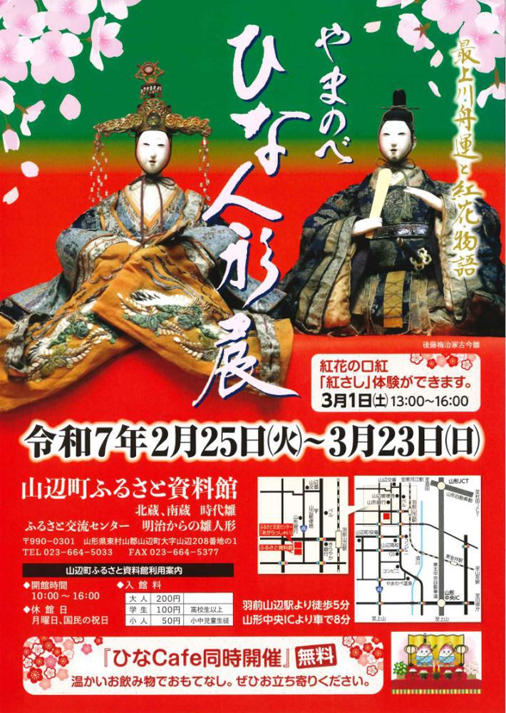 ふるさと資料館にて、2月25(火)〜3月23(日)まで、「やまのべひな人形展」を開催します。山辺町には、江戸時代より最上川舟運や紅花交易で取り寄せたとされる貴重な時代雛がたくさん残されています。蔵座敷を活用した展示室に、山辺町に代々伝わる寛永からの貴重な時代雛の数々を公開します。昔ながらの雛との出会いをお楽しみ下さい。また、隣接する交流センターでは、明治から昭和のひな人形も展示しています。ひなCaféも同時開催されますのでぜひお立ち寄りください! 日 時:令和7年2月25日(火)〜3月23日(日) 10:00〜16:00 ※月曜日・祝日は休館日場 所:ふるさと資料館入館料:大人200円、学生(高校生以上)100円、小人(小中児童生徒)50円お問い合わせ先:ふるさと資料館 TEL023−664−5033