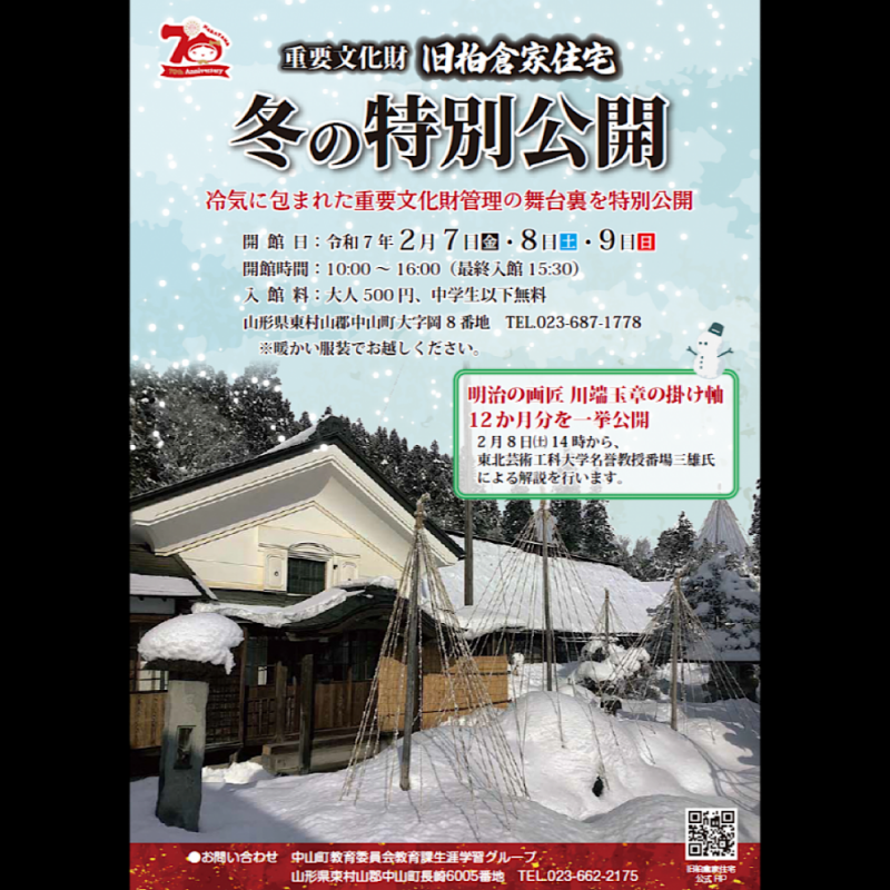 旧柏倉家住宅(九左衛門家)は、山形県東村山郡中山町岡地区に位置する国指定の重要文化財です。近世の上層農家の形式を継承した大規模住宅で、主屋の座敷や精緻な内装、漆塗りや金箔で荘厳な仏間、春慶塗で華やかに彩る前蔵の上質な蔵座敷など、見どころが豊富です。冬季休館中の旧柏倉家住宅ですが、特別に公開される機会があります。この特別公開では、普段は目にすることのできない冬の旧柏倉家住宅の趣を体感できます。歴史的建造物の冬景色を楽しみながら、その歴史や文化に触れてみてはいかがでしょうか。お問い合わせ先: 中山町教育委員会教育課生涯学習グループ(文化財担当)〒990-0401 山形県東村山郡中山町大字長崎6005番地(町立歴史民俗資料館内)TEL: 023-662-2175 / FAX: 023-616-6875最新の情報や詳細は、旧柏倉家住宅の公式ウェブサイトをご覧ください。(旧柏倉家住宅ホームページ:kashiwakurake.jp)