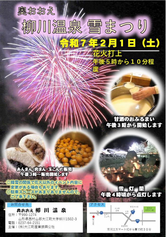 朝日連峰山麓にある奥おおえ柳川温泉にて開催されます。静かな温泉で雪見風呂を楽しんでみてはいかがでしょうか。また、17:00から花火の打ち上げを予定しております。冬の夜空を彩る花火をお楽しみください。【日程】2/1(土)【場所】奥おおえ柳川温泉【問い合わせ】奥おおえ柳川温泉 電話:0237-64-2151【イベント詳細】大江町観光物産協会ホームページ
