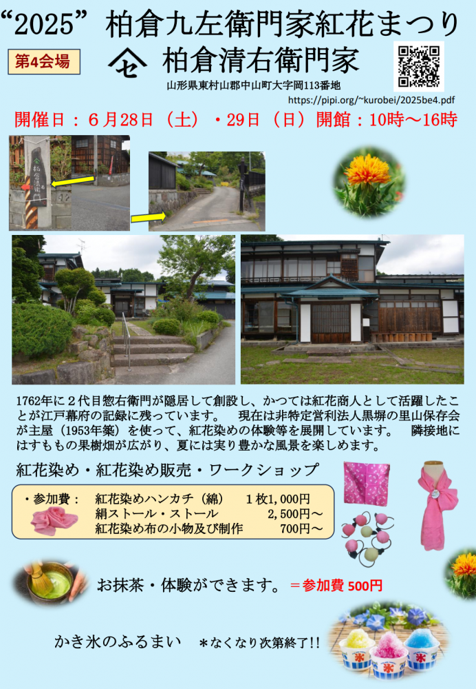 2025年6月28日・29日に開催される「柏倉九左衛門家紅花まつり」。この記事では、第4会場となる「柏倉清右衛門家」での紅花染めなどの体験イベントに焦点を当てて、その魅力をご紹介します。柏倉清右衛門家 イベント情報2025 柏倉九左衛門家 紅花まつり山形県中山町で毎年開催される「柏倉九左衛門家紅花まつり」。江戸時代に良質な紅花を生産した豪農・柏倉一族の屋敷と、鮮やかな紅花が彩る黒塀のまちなみを巡るお祭りです。今回は、柏倉九左衛門家紅花まつりの第4会場となる「柏倉清右衛門家」でのイベント情報に特化してご紹介します。 イベント概要 開催日令和7年6月28日(土)・29日(日) 開館時間10:00〜16:00 会場柏倉清右衛門家(山形県東村山郡中山町大字岡113番地) 紅花の見ごろ6月下旬〜7月上旬 1762年に2代目惣右衛門が隠居して創設された柏倉清右衛門家は、江戸幕府の記録にも残る紅花商人として活躍しました。現在はNPO法人黒塀の里山保存会が、築1953年の主屋を活用し、紅花染めの体験などを提供しています。隣接するすももの果樹畑が広がり、夏には豊かな実りの風景も楽しめますよ。 体験・販売プログラム 紅花染め体験・販売 紅花染めハンカチ(綿) 1枚1,000円 絹ストール・ストール1枚2,500円〜 紅花染め布の小物1点700円〜 お抹茶体験ご自身で茶筅(ちゃせん)を振って、お抹茶を楽しめます。参加費:500円 かき氷のふるまい来場者への嬉しいサービスですが、なくなり次第終了となりますので、お早めにどうぞ。イベントチラシはこちら (PDF) 関連情報まつり全体の情報はこちら他の会場のイベントもチェック!中山町をもっと楽しむ周辺の観光スポット情報も満載のパンフレット{"@context":"https://schema.org","@graph":[{"@type":"Event","name":"柏倉九左衛門家紅花まつり 第4会場 柏倉清右衛門家イベント","startDate":"2025-06-28T10:00:00+09:00","endDate":"2025-06-29T16:00:00+09:00","eventAttendanceMode":"https://schema.org/OfflineEventAttendanceMode","eventStatus":"https://schema.org/EventScheduled","location":{"@type":"Place","name":"柏倉清右衛門家","address":{"@type":"PostalAddress","streetAddress":"岡113番地","addressLocality":"中山町","addressRegion":"山形県","addressCountry":"JP"}},"image":["https://ssl.samidare.jp/~lavo/yamagatakouiki/box/IMG_5123.jpeg"],"description":"柏倉九左衛門家紅花まつりの第4会場として、紅花染め体験、お抹茶体験、かき氷のふるまいなどが行われます。","offers":{"@type":"Offer","price":"0","priceCurrency":"JPY"},"organizer":{"@type":"Organization","name":"NPO法人黒塀の里山保存会"}},{"@type":"Article","mainEntityOfPage":{"@id":"https://yamagata-kouiki.info/"},"headline":"【柏倉清右衛門家】紅花まつり2025|紅花染め体験で特別な思い出を","author":{"@type":"Organization","name":"やまがた広域観光協議会","url":"https://yamagata-kouiki.info/"},"publisher":{"@type":"Organization","name":"やまがた広域観光協議会","logo":{"@type":"ImageObject","url":"https://yamagata-kouiki.info/images/logo.png"}},"datePublished":"2025-06-15T11:00:00+09:00","dateModified":"2025-09-17T21:00:00+09:00"}]} document.addEventListener("DOMContentLoaded", () => { const sections = document.querySelectorAll(".section-fade"); const observer = new IntersectionObserver( entries => { entries.forEach(entry => { if (entry.isIntersecting) { entry.target.classList.add("visible"); observer.unobserve(entry.target); } }); }, { threshold: 0.1 } ); sections.forEach(section => { observer.observe(section); }); });.aikiji_honbun{font-family:'M PLUS Rounded 1c','Hiragino Mincho Pro',serif;background-color:#fffaf4 !important;color:#333;font-size:16px;line-height:1.8;padding:20px;}.hero-section{background-color:#5a4a40;color:#fff;padding:30px 20px;border-radius:12px;text-align:center;margin-bottom:40px;box-shadow:0 6px 20px rgba(0,0,0,0.1);}.hero-section h1{margin:0;font-size:28px;font-weight:700;line-height:1.4;color:#fff !important;}.hero-section span{font-size:0.7em;font-weight:400;opacity:0.9;color:#fff !important;}.section-wrapper{margin-bottom:50px;}.section-title{font-size:1.6em;font-weight:bold;color:#5a4a40;margin:50px 0 25px 0;padding-left:15px;border-left:5px solid #a2907a;display:flex;align-items:center;}.section-title i{margin-right:12px;color:#a2907a;}.info-box{background-color:#fff;border:1px solid #a2907a;border-left:5px solid #a2907a;border-radius:8px;padding:20px;}.info-box ul{list-style:none;padding:0;margin:0;}.info-box li{display:flex;align-items:flex-start;padding:10px 0;border-bottom:1px dashed #d7ccc8;}.info-box li:last-child{border-bottom:none;}.info-box i{font-size:1.2em;margin-right:15px;color:#5a4a40;width:20px;text-align:center;padding-top:4px;}.info-label{font-weight:bold;display:block;margin-bottom:3px;}.static-gallery{display:grid;grid-template-columns:repeat(auto-fit,minmax(200px,1fr));gap:10px;margin:30px 0;}.gallery-item img{width:100%;height:200px;object-fit:cover;border-radius:8px;}.experience-grid{display:grid;grid-template-columns:repeat(auto-fit,minmax(250px,1fr));gap:20px;margin-top:20px;}.experience-card{background-color:#fff;padding:20px;border-radius:8px;border:1px solid #eee;box-shadow:0 2px 5px rgba(0,0,0,0.05);}.experience-card h4{font-size:1.2em;font-weight:bold;color:#333;margin:0 0 10px 0;display:flex;align-items:center;}.experience-card i{margin-right:10px;color:#c42e3d;}.experience-card ul{list-style:none;padding-left:0;margin:0;font-size:0.95em;}.experience-card li{margin-bottom:5px;}.pdf-link{display:inline-block;padding:12px 25px;background-color:#006400;color:#fff !important;text-decoration:none;border-radius:5px;fon